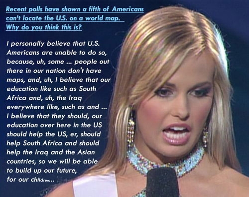 Hoa hậu teen Nam Carolina Caitlin Upton đã có màn ứng xử không thể tệ hơn tại chung kết cuộc thi Hoa hậu teen Mỹ 2007. Khi được hỏi về vấn đề 20% người Mỹ không thể định vị được bản đồ, Caitlin đã lập cập trả lời: "Cá nhân tôi nghĩ rằng người Mỹ không thế làm thế được bởi vì nhiều người trong số chúng ta không có bản đồ. À ừ, tôi tin vào nền giáo dục của Mỹ cũng giống như một số nước Nam Phi, Iraq... và à ừ… tôi nghĩ rằng nền giáo dục của nước Mỹ cần phải giúp đỡ người Mỹ, giúp đỡ Nam Phi, Iraq và cả các nước Châu Á, qua đó có thể xây dựng tương lại cho chúng ta".