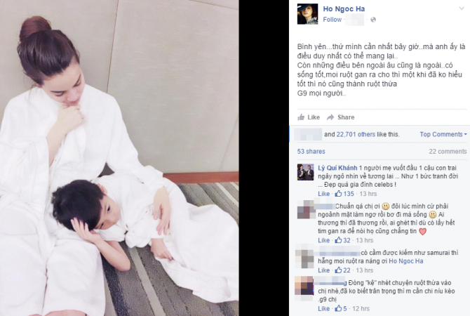 Mới đây, trên trang cá nhân của mình, Hà Hồ đã trải lòng về một người, người duy nhất có thể mang lại bình yên cho cô ở thời điểm hiện tại. Nữ ca sĩ đăng tải một bức hình của mình với con trai Subeo kèm theo lời tâm sự : “Bình yên…thứ mình cần nhất bây giờ..mà anh ấy là điều duy nhất có thể mang lại. Còn những điều bên ngoài âu cũng là ngoài..có sống tốt, moi ruột gan ra cho thì một khi đã không hiểu tốt thì nó cũng thành ruột thừa”.