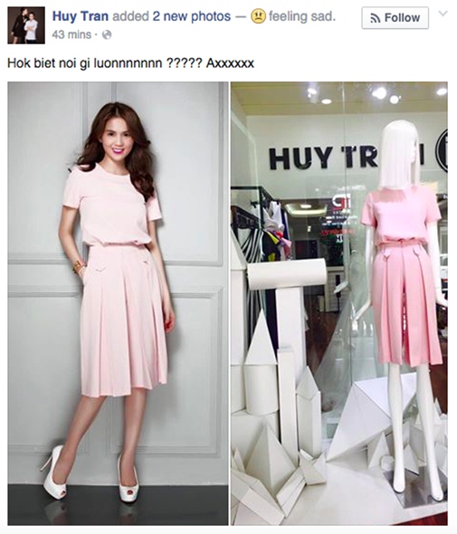 Nhà thiết kế Huy Trần bất ngờ khi thấy mẫu trang phục của mình bị Ngọc Trinh copy.