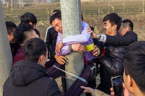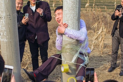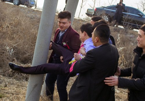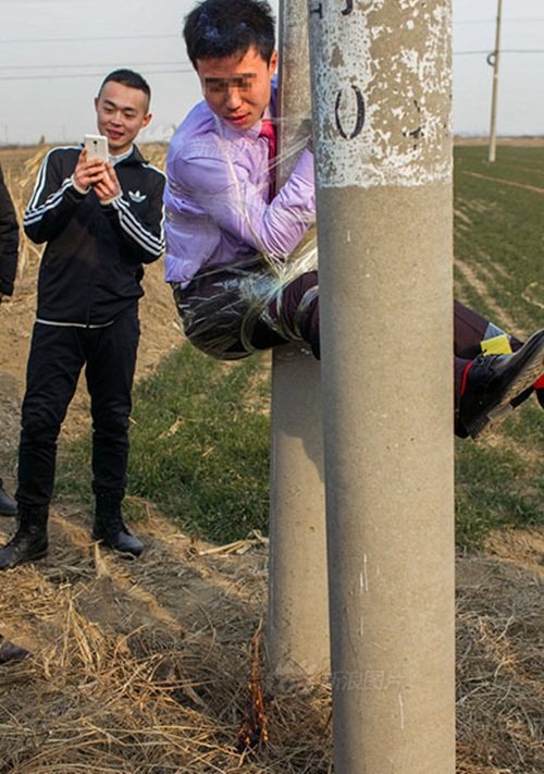 Chú rể đã bị bạn bè lột hết áo khoác, khống chế rồi dùng băng dính trói chặt lên cây cột điện gần đó, ngăn không cho chú rể thân mật cùng cô dâu.