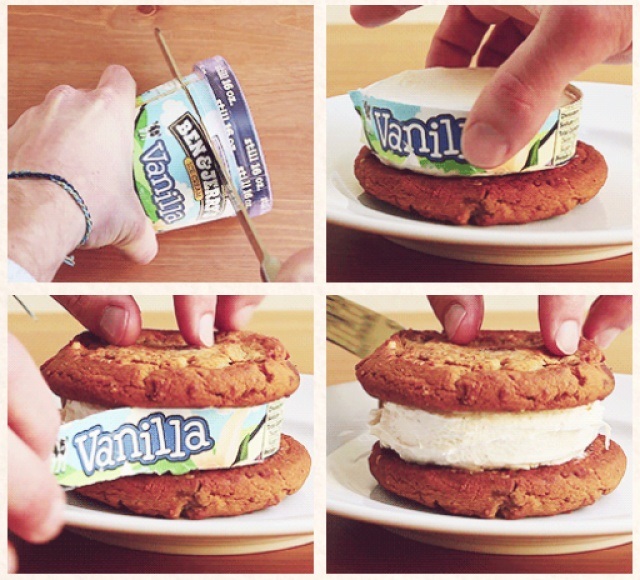 Cách nhanh nhất để làm 1 chiếc sanwich kem là chuẩn bị 2 miếng bánh cookie cỡ lớn, 1 hộp kem và làm như hướng dẫn!