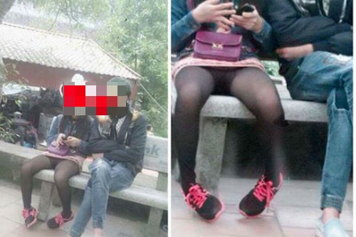 Chỉ nhìn thoáng qua, ta cũng dễ dàng nhận thấy trong ảnh là một cặp đôi nam nữ ngồi nghỉ trên ghế đá. Tuy nhiên cô gái này diện chiếc quần tất quá mỏng để lộ cả nội y, thậm chí cô không ngồi khép đùi lại mà còn "thoải mái" xoạc chân như chốn không người.