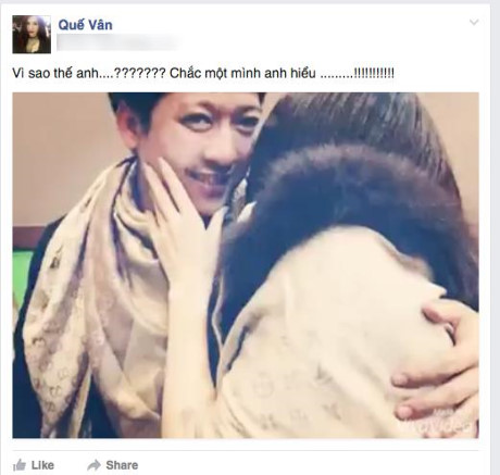 Việc Quế Vân công khai mối quan hệ tình cảm với Trường Giang đúng vào thời điểm "bão dư luận" là do anh đã làm cô "thất vọng hết lần này đến lần khác và để mọi ngưỡi rõ hơn về 1 con người và cả ekip của anh".
