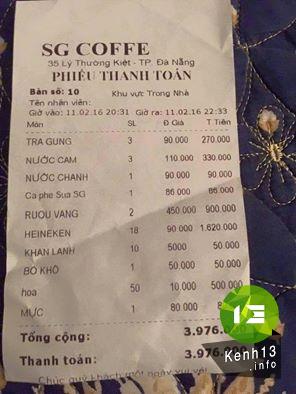 Sáng 15/2, một facebook có tên Luu Bach Van chia sẻ thông tin trên Group Quản lý đô thị Đà Nẵng về hiện trạng “chặt chém” tại một quán cafe mang tên SG Coffee nằm trên đường Lý Thường Kiệt. Theo giá bình thường hàng ngày của quán cafe này chỉ giao động từ 10.000 đến 25.000 đồng cho mỗi thứ đồ uống khách hàng đã chọn. Tuy nhiên, khi nhìn vào hóa đơn giao cho khách hàng, mọi người không khỏi phải “choáng” khi số tiền thực khách phải trả lên đến gần 4 triệu đồng.