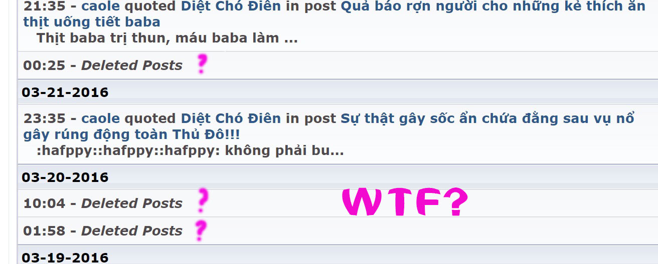 Tao là MOD thì tao thích delete cái gì thì tao delete; tao thích BAN đứa nào thì tao BAN... Không cần lý do lý diếc cái con mẹ gì hết á... Cấm lèm bèm, không thích thì... cút xuống cống ngay.... Hehehehe....