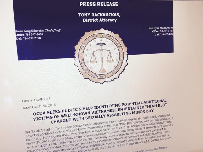Văn pḥng biện lư Quận Cam (OCDA, California, Mỹ) thông báo "Minh Béo bị khởi tố ngày 25-3 với các tội danh quan hệ đường miệng (oral copulation) với trẻ em, âm mưu hành vi bệnh hoạn với trẻ em dưới 14 tuổi..."