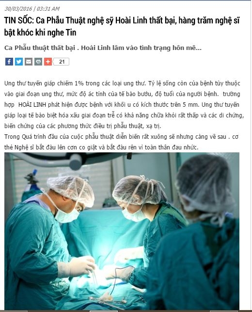 Sáng nay, khán giả, người hâm mộ Việt Nam lại “phát hoảng” khi tiếp cận thông tin liên quan đến NSƯT Hoài Linh. Theo đó, một số trang thông tin điện tử đă đưa rằng ca phẫu thuật ung thư tuyến giáp của Hoài Linh thất bại. Sau đó, nghệ sĩ hài danh tiếng đă rơi vào hôn mê. Tuy nhiên, thông tin này lại khiến khán giả nghi ngờ bởi vài ngày trước đây, Hoài Linh vẫn khoẻ mạnh tham gia diễn xuất. Hôm qua, nhiều trang báo c̣n đưa tinHoài Linh đă nộp đơn để xin đổi mục đích sử dụng đất tại quận 9 nhằm hoàn thành công tŕnh xây dựng đền thờ tổ.
