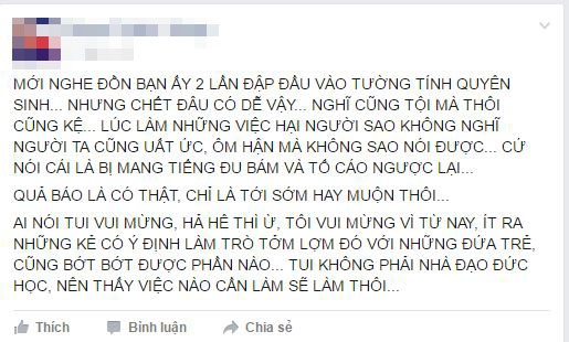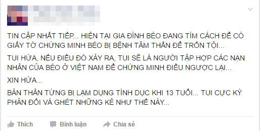 Tuy nhiên, vẫn xuất hiện một vài thông tin bên lề. Theo đó, một vài chia sẻ trên mạng xă hội cho rằng nam diễn viên hài đă có ư định quyên sinh khi đập đầu vào tường 2 lần. Song đó cũng xuất hiện tin đồn, gia đ́nh của Minh Béo đang “lo” giấy tờ chứng nhận tâm thần để trốn tội.