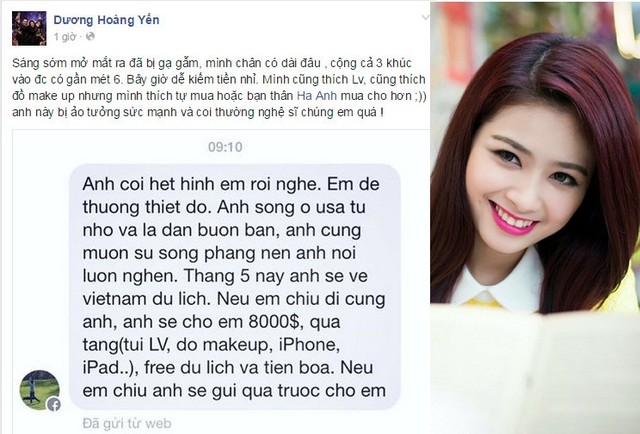 Cách đây khoảng 1 năm, nữ ca sĩ Dương Hoàng Yến đăng tải bức ảnh chụp lại màn hình điện thoại lên trang cá nhân. Nội dung của bức ảnh là tin nhắn với những lời lẽ gạ gẫm, dụ dỗ cô "đi du lịch cùng".