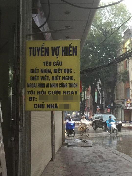 Theo đó, chủ nhân của tấm bảng này đang mong muốn kiếm được vợ hiền với những yêu cầu như: biết nhìn, biết đọc, biết viết, biết nghe, ngoại hình ai nhìn cũng thích, tôi hỏi cưới ngay. Những hình ảnh về tấm bảng tuyển vợ này sau đó được chia sẻ trên mạng xã hội và tạo nên cuộc tranh luận trái chiều.