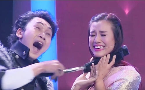 Khán giả đứng tim, hồi hộp nhìn á hậu Hoàng Oanh. Con chăn quấn quanh cổ sau đó là dao đâm. Liệu rằng cô sẽ ra sao.