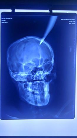 Kết quả chụp X-quang cho thấy phần đầu nhọn của dao cắm sâu 4 cm vào não. Theo người nhà bệnh nhân, vụ tai nạn hi hữu xảy ra khi bố chồng của chị T. sửa mái nhà đã vô tình làm rơi con dao dắt trong người xuống, cắm thẳng vào đầu con dâu đang đi qua ở phía dưới.