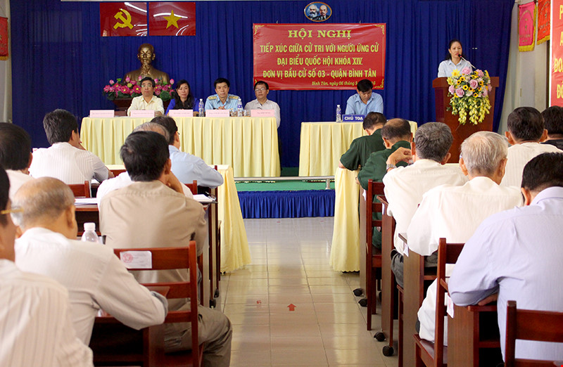 Hội nghị Tiếp xúc giữa cử tri với người ứng cử ĐBQH khóa XIV đơn vị bầu cử số 3 - quận Bình Tân gồm Thiếu tướng Lâm Quang Đại - Phó Chính ủy Quân chủng Phòng không - Không quân (Bộ Quốc phòng), bà Phan Thị Bình Thuận - Phó Giám đốc Sở Tư pháp TP, ông Diệp Dũng - Chủ tịch HĐQT Liên hiệp HTX Thương mại TP, bà Triệu Lệ Khánh - Phó Chủ tịch UBMTTQ Việt Nam TP, ông Nguyễn Phước Lộc - Chủ nhiệm UB Kiểm tra Đảng ủy Ban Dân vận Trung ương.