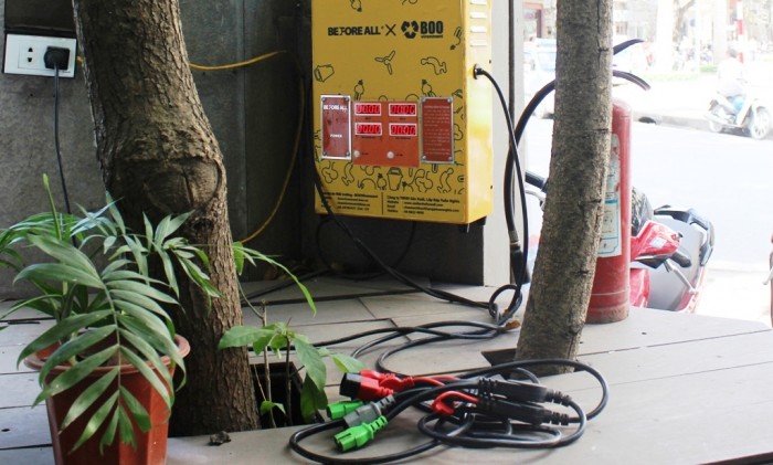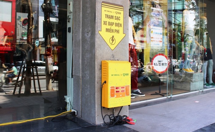 Điểm sạc điện miễn phí có đủ các loại đầu sạc của các dòng xe đạp điện khác nhau (Trạm sạc điện trên phố Bà Triệu).