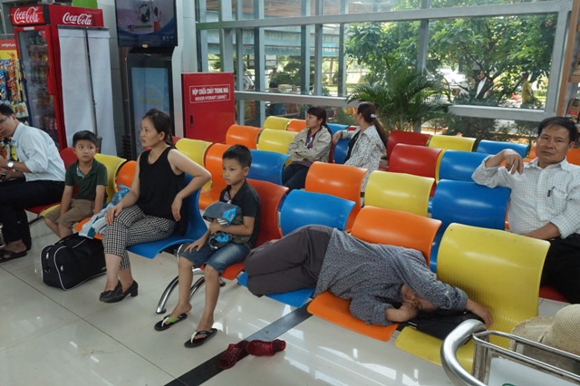 Sáng 3/6, hàng chục hành khách có chuyến bay tại Cảng hàng không Buôn Ma Thuột báo tin, họ liên tục bị hoãn bay nhưng không được cho biết lý do. Có mặt tại Cảng hàng không Buôn Ma Thuột, PV VietNamNet ghi nhận, hành khách của các hãng hàng không lỉnh kỉnh hành lý người nằm, kẻ ngồi chờ bay. Khuôn mặt nhiều người tỏ ra mệt mỏi, có người tranh thủ nằm ngủ vật vờ ngay trên ghế chờ. Anh Trịnh Văn Toàn (35 tuổi, trú TP Buôn Ma Thuột) phản ánh, anh mua vé hãng VietJet, bay từ Buôn Ma Thuột về TP Vinh cùng vợ và hai con để lo việc gia đình. Theo thông báo trong vé, máy bay sẽ cất cánh lúc 10h20. 9h sáng anh lên làm thủ tục thì được thông báo sẽ bay trễ 30 phút. Tuy nhiên, chờ đến hơn 12h trưa vẫn chưa thể bay. Sau đó lại được báo sẽ hoãn chuyến bay đến 16h40