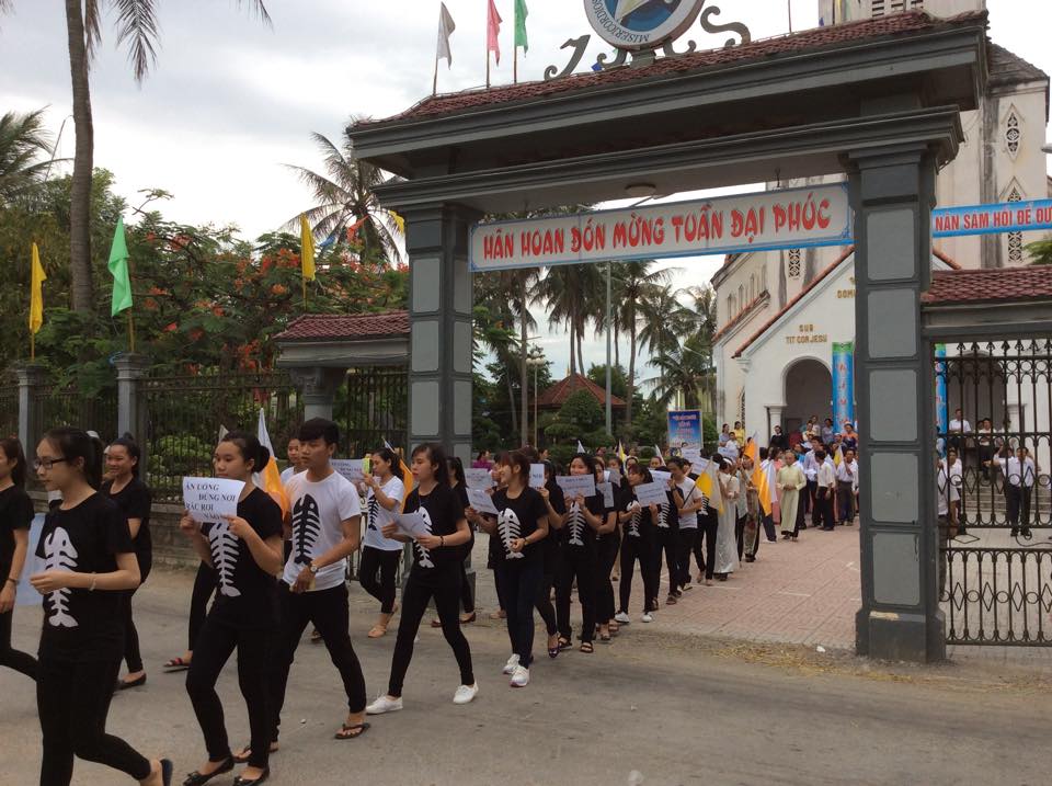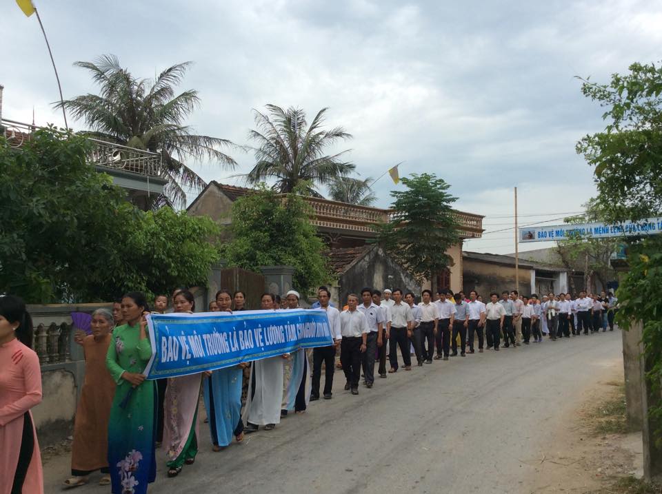 Sau thánh lễ sáng Chúa Nhật, từ người già cho đến trẻ nhỏ đều ăn mặc chỉnh tề với nhiều băng rôn và khẩu hiệu xuống đường biểu tình phản đối Formosa, đòi công lý cho các nạn nhân thảm họa môi trường và bày tỏ tình hiệp thông với Đức Cha Phaolô Nguyễn Thái Hợp, giám mục giáo phận Vinh.