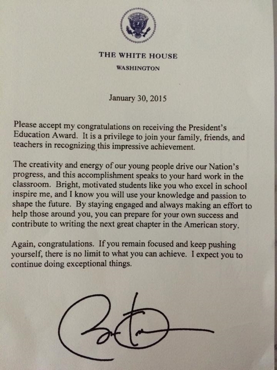 Trong bức thư, ông Obama viết: “Những học sinh thông minh, năng động như em truyền cảm hứng cho tôi và tôi tin rằng em sẽ dùng những kiến thức của mình để tạo dựng nên tương lai. Nếu em tiếp tục phát huy những gì em đã thể hiện trong thời gian qua, tôi tin rằng em có thể gặt hái được thành công trong tương lai.”.