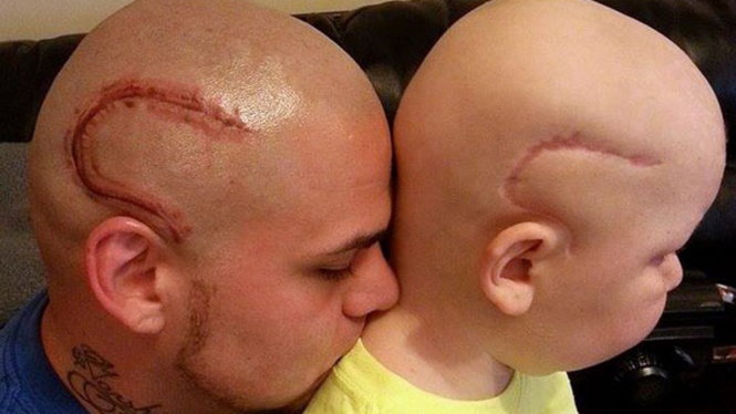 Cậu bé mới chỉ 8 tuổi nhưng đã bị ung thư tìm đến. Và ông bố đã giúp con vượt qua khó khăn bằng cách “đồng cảm” với con. Sau ca phẫu thuật ung thư não, cậu bé Gabriel, 8 tuổi, bị một vệt sẹo dài trên đầu. Để cổ vũ con, ông bố Josh Marshall đã cạo đầu và xăm hình giống hệt vết sẹo của con.