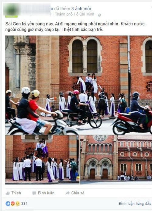 VBF-Chia tay khi ra trường thì thiếu gì chỗ để họ có thể chụp hình lưu niệm và địa điểm thích hợp nhất là chỉ có ở ngôi trường họ học mà thôi. Vậy àm họ lại tới Nhà Thờ Đức Bà để leo trèo chụp ảnh làm mất đi sự tôn nghiêm.Quá phản cảm. Sài Gòn thiếu gì nơi chụp ảnh đẹp mà phải leo rào thế này. Lại ở ngay nhà thờ Đức Bà, nơi người qua lại đông đúc, du khách nước ngoài nhiều. Còn đâu những tà áo dài truyền thống thướt tha, dịu dàng của con gái Việt???