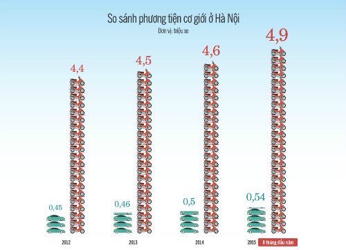 Tuy nhiên trên thực tế thành phố chưa đưa ra giải pháp cụ thể nào, số lượng ôtô xe máy vẫn tăng mạnh. Số liệu Phòng cảnh sát giao thông, Công an Hà Nội công bố cuối năm 2015, tám tháng đầu năm 2015, Hà Nội có 183.000 phương tiện đăng ký mới (hơn 39.000 ôtô, 143.000 môtô), nâng tổng số xe tại thủ đô lên 5,5 triệu (gần 535.000 ôtô và hơn 4,9 triệu môtô), chưa kể nhiều xe mang biển ngoại tỉnh vẫn hoạt động.