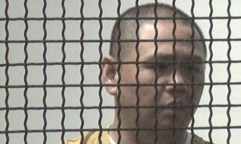 Minh Béo mặc đồng phục phạm nhân đứng sau lồng sắt chờ đến phiên xử thứ 4, tinh thần anh trông thoải mái hơn trước.