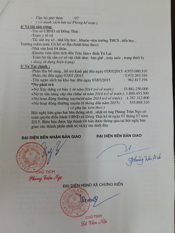 Thế nhưng con số đáng quan tâm là 38.024.904.610 đồng từ lần bàn giao chức danh Chủ tịch UBND xã Đồng Thái diễn ra hôm 10/7/2015. Đây là số nợ được ông Phùng Trần Anh, nguyên Chủ tịch UBND xã bàn giao lại cho người kế nhiệm là ông Phùng Trần Ngọ.