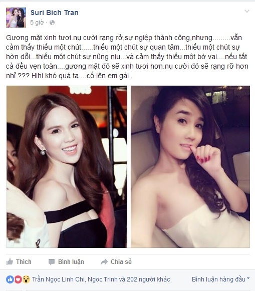 Nếu tất cả đều vẹn toàn, gương mặt đó sẽ xinh tươi hơn, nụ cười đó sẽ rạng rỡ hơn nhỉ? Khó quá ta. Cố lên em gái!", chị gái Ngọc Trinh viết.