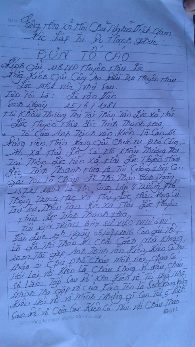 Ông Đỗ Xuân Liên, Chủ tịch UBND xã Hải Lộc (huyện Hậu Lộc, Thanh Hóa) cho biết, địa phương đã nhận được đơn tố cáo của gia đình anh Vân, liên quan tới việc tố cáo anh Kiên - Phó công an của xã có hành vi hãm hiếp cháu T.