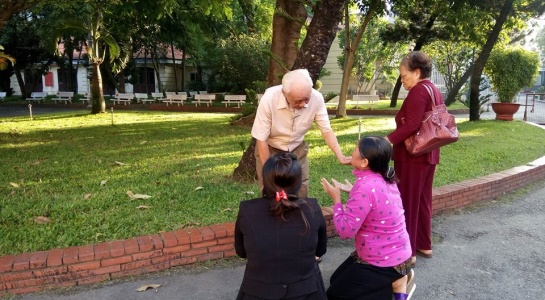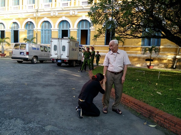 Sáng nay, 18.7, TAND TP.HCM xét xử phúc thẩm vụ án “Thảm sát Bình Phước”. Người nhà của nạn nhân và bị cáo đều có mặt khá sớm tại tòa án. Trước khi bước vào phòng xử án, một tình huống bất ngờ đã xảy ra khi hai người phụ nữ là chị và mẹ của bị cáo Vũ Văn Tiến đã bất ngờ quỳ lạy một người đàn ông.