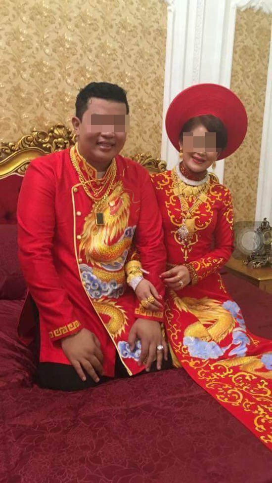 Hình ảnh cặp đôi cô dâu chú rể với của hồi môn nặng trĩu cổ.