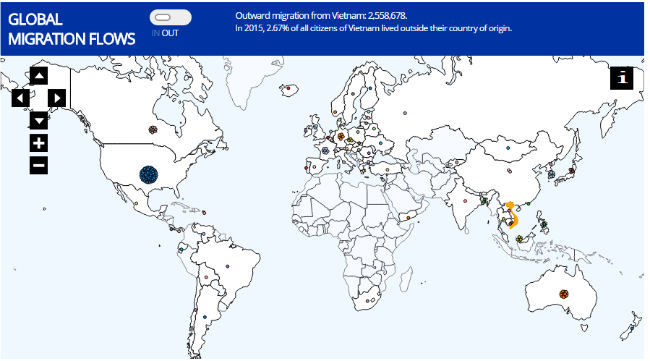 Bản đồ di cư của người Việt. Biểu tượng chấm hoa chỉ những quốc gia, vùng lãnh thổ có người Việt sinh sống. Nguồn: IOM