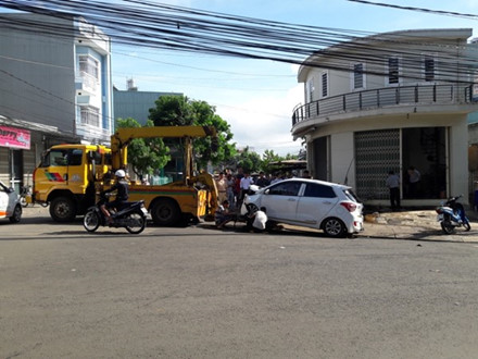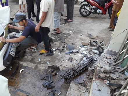 Tại hiện trường, ô tô nát vụn phần đầu, vỡ gương trước, nổ 2 lốp xe, nhiều mảnh vỡ rơi ra mặt đường. Hai chiếc xe máy bị hư hỏng.