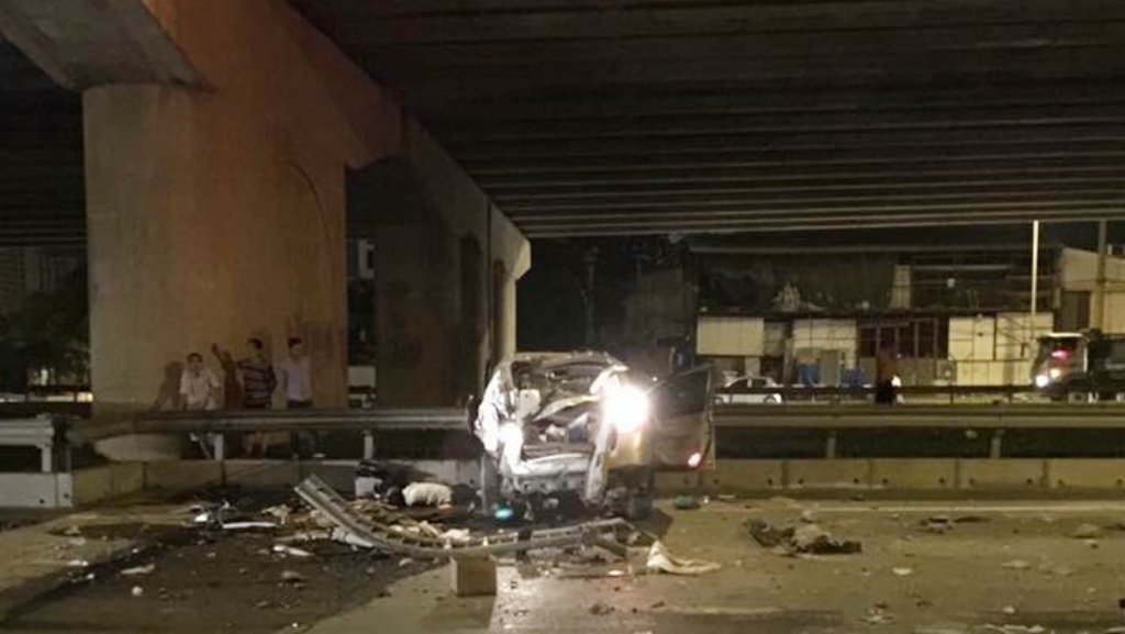 Chiếc ô tô rơi xuống đất bị bẹp dúm, tài xế văng ra khỏi xe, tử vong tại chỗ. Khoảng cách từ đường trên cao xuống đường phía dưới gần 10 m.