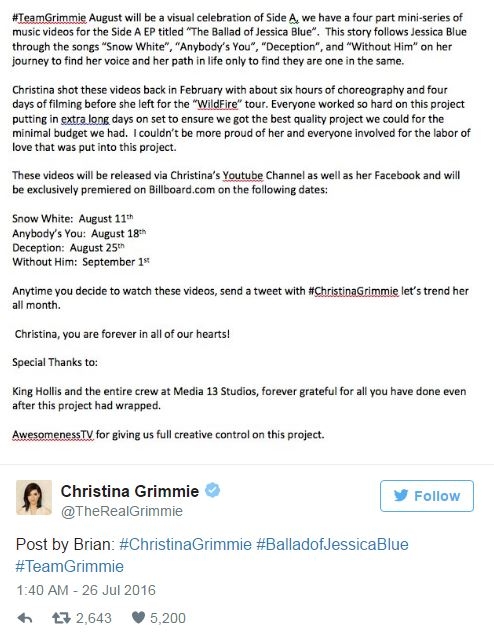 Trang Billboard gần đây đưa tin, các cộng sự của Christina Grimmie sẽ phát hành 4 video ca khúc mới của cô trong tháng 8 qua kênh youtube riêng của nữ ca sĩ và độc quyền trên bảng xếp hạng Billboard.