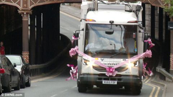 Vì muốn tạo bất ngờ cho chú rể, cô dâu đã chọn một chiếc xe tải nặng 26 tấn làm xe hoa. Trong khi hầu hết phụ nữ đều có mơ ước được rước dâu bằng những chiếc xe sang trọng, thì vị hôn thê của một chàng lao công tại Anh lại mong muốn theo chồng về dinh trên một chiếc xe chở rác.