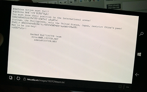 “Nạn nhân” của nhóm hacker này là trường ĐH Kinh tế Quốc dân. Website của trường đại học này đã bị xâm nhập và đưa lên một tập tin. Thủ phạm của cuộc tấn công này lại là nhóm hacker Trung Quốc 1937CN.
