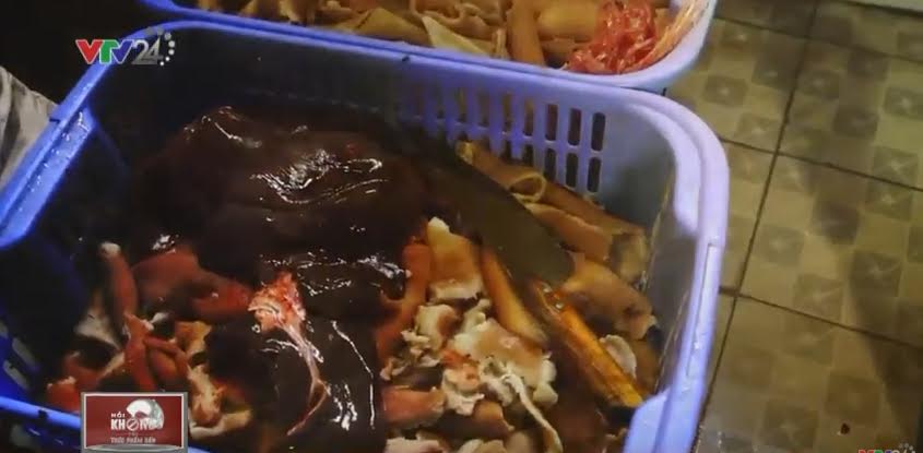 Đoạn phóng sự dài 4 phút được thực hiện tại một cơ sở sản xuất xúc xích, patê ở xã Tiên Phương, huyện Chương Mỹ (Hà Nội). Theo thông tin của phóng viên VTV, người chủ xưởng năm nay dù mới 29 tuổi nhưng đã có 14 năm kinh nghiệm trong nghề. Công suất của xưởng lên đến "cả trăm kg một ngày". Trong clip, người xem dễ dàng nhìn thấy những rổ bì lợn, nội tạng lợn được bày dàn trải trong nhà, ruồi nhặng bay khắp nơi, bu vào cả nguyên liệu chế biến.