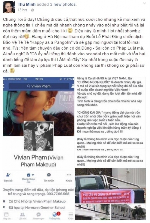 Thu Minh lên tiếng về scandal bị tố quỵt nợ (Ảnh: FBNV)
