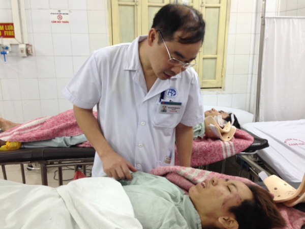 Giám đốc Bệnh viện Nguyễn Đình Hưng cho biết, nạn nhân nhập viện trong tình trạng hốt hoảng, lo sợ, khó thở. Một bệnh nhân bị xây xát phần ngực, dập mông, đau đầu, có vết thương ở thái dương, không tổn thương sọ não.