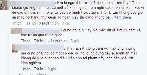 Trong khi đó, nich name Nguyen Thi Phuong Cuc viết: “Em là người thường đi du lịch xa một mình và đi xe khách giường nằm nên có một số kinh nghiệm em nghĩ các bạn nên xem xét vì dù sao đi nữa, mình phải tự bảo vệ mình trước tiên.